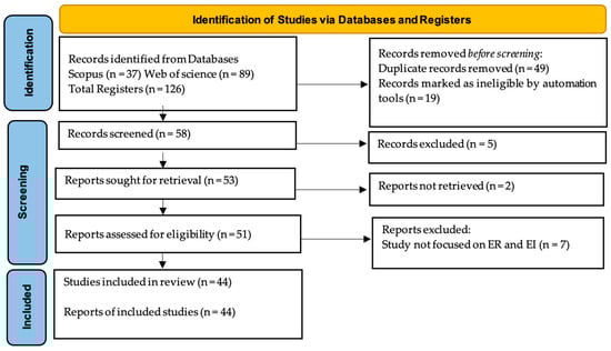 There were 126 results from the search in the Web of Science and Scopus databases. Of these, 49 were duplicates that showed up in searches using various keyword selections or in both databases, and 19 were automatically filtered out by the platforms since they were not published in journals. The abstracts of 58 papers were examined to determine whether they aligned with the study’s goals after duplicate articles were eliminated. Five publications were excluded because this study only included articles that were specifically focused on EI and Resilience in order to compare the findings of previous studies and comprehend the implications of these constructs. The remaining articles were then retrieved for additional examination. Only 51 articles were recovered, though, because two of the 53 remaining articles could no longer be found on the journal’s website, and the accompanying author could not be reached. Despite having the keywords, seven out of the 51 reviewed papers did not focus on EI and ER. The idea was not covered in these seven studies. This study ultimately contained 44 publications.