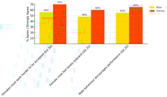 e. Workplace discrimination and harassment—Women seafarers reported high levels of discrimination and harassment onboard. A study conducted by Ewedji et al. (2024) on Ghana’s maritime sector found that sexual harassment is a prevalent issue, with 43% of female seafarers experiencing some form of verbal or physical abuse at sea. Also, they proved that women often feel socially isolated onboard (i.e., as ships typically having only one or two female crew members per vessel), onboard workplace bullying is present, and a lack of female mentors further discourages women from pursuing long-term careers in maritime professions.