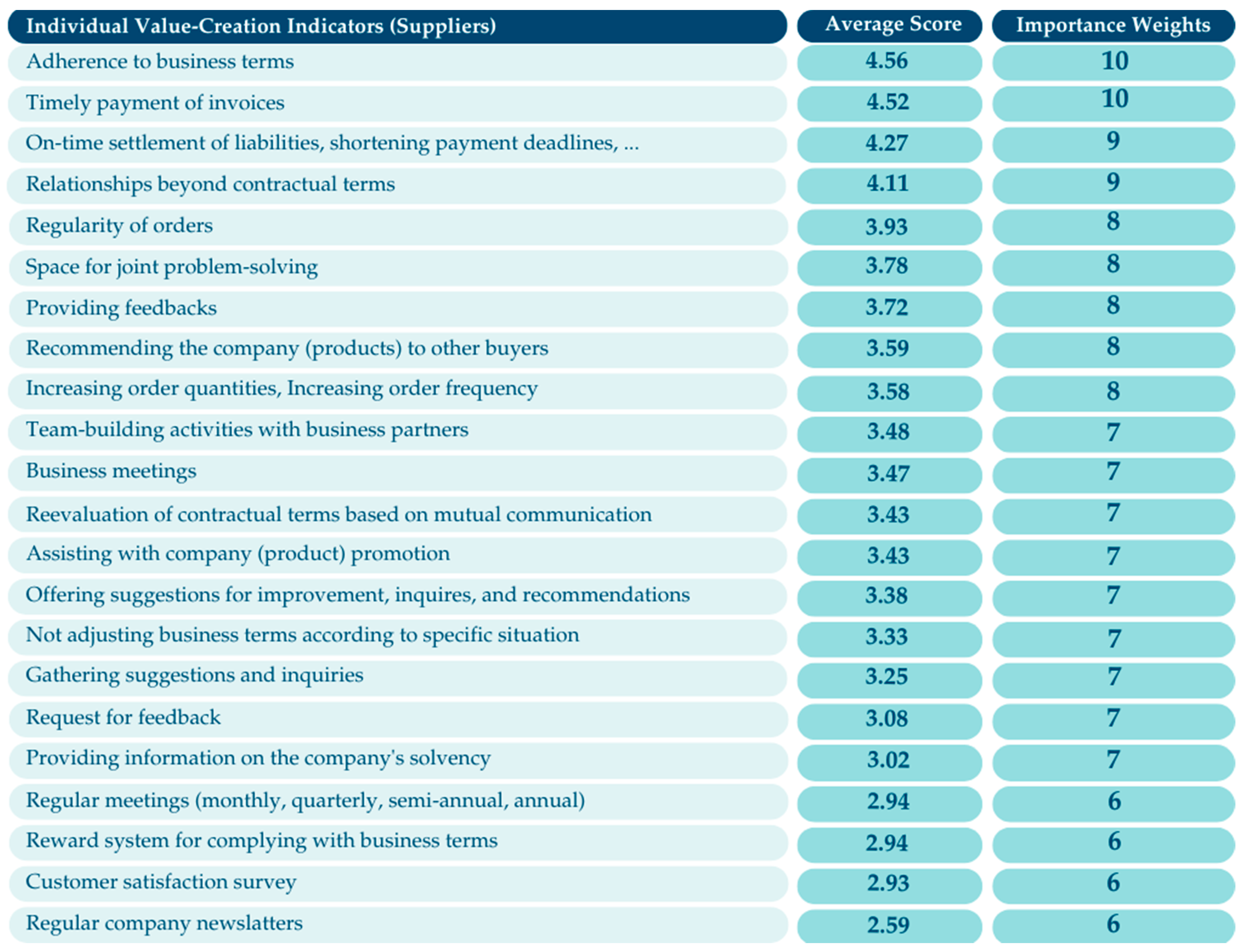 - The absence of a determination regarding the importance of these value-creation indicators, as perceived by suppliers and buyers.