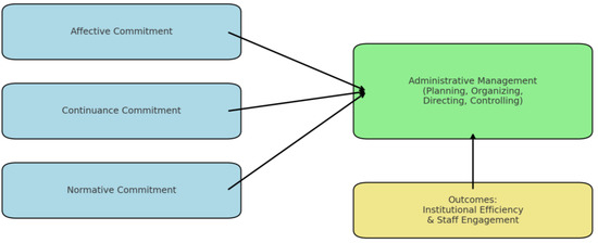 These results support Meyer and Allen’s (1991) multidimensional commitment model and highlight the need for police institutions to adopt strategies that promote emotional engagement, career development, and a culture of mutual responsibility. Moreover, the findings confirm prior national research—such as Garay (2018) and Quispe (2017)—demonstrating that administrative performance is not only a technical matter but also a psychological and relational dynamic shaped by workforce perceptions and institutional practices. In conclusion, the analysis validates all proposed hypotheses and objectives, confirming that a committed workforce is significantly linked to improved administrative performance. Nonetheless, it is important to interpret these results with caution. The limited sample size and single-site design restrict external generalizability. Moreover, the cross-sectional nature of the study does not allow for causal inference. Additionally, the geographic and institutional specificity of the study—focused on a single operational police unit—limits the applicability of the findings to other public institutions, especially those operating in structurally or culturally different environments. Variations in organizational hierarchy, leadership styles, or internal communication protocols may significantly influence the way commitment and administrative practices interact. Therefore, caution is required when attempting to generalize these results beyond comparable public security settings. These limitations were considered when formulating the implications and underscore the need for longitudinal and comparative research in similar contexts. In addition, while the methodology section clearly details the design and sample characteristics, a visual synthesis of the analytical model could enhance reader comprehension. Accordingly, a diagram illustrating the relationship between organizational commitment dimensions and administrative management functions is included (see Figure 5). This supports the conceptual clarity of the research framework.