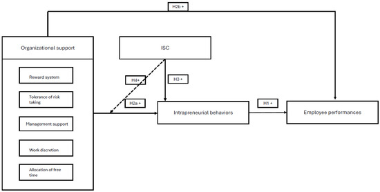 The relationship between organizational support and employee performance through intrapreneurial behaviors is moderated by ISC.