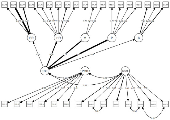 At first, CFA was conducted. All standardized factor loadings exceeded the recommended cutoff of 0.40 (Brown, 2015). For example, loadings for the general self-efficacy (GENSE) indicators ranged from 0.662 to 0.709; optimism (POS) from 0.476 to 0.609; and for the dimensions of entrepreneurial self-efficacy (ESE), the loadings ranged from 0.462 to 0.858. (See Table 1 and Figure 2 for a summary of the loadings).