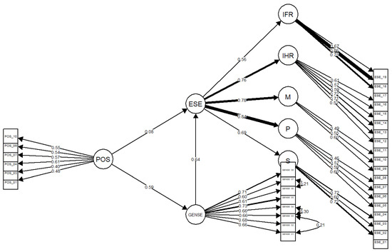 Although the Fornell–Larcker criterion (Fornell & Larcker, 1981) was not fully met for several constructs—namely, the square roots of the AVE for GENSE, POS, S, P, M, and IHR were lower than their maximum inter-construct correlations—this issue may reflect the inherent conceptual overlap among these constructs as defined by prior theory (Hair et al., 2010). The constructs, however, demonstrated adequate composite reliability (ω > 0.62 for all) and acceptable convergent validity (AVE values approaching the recommended 0.50 threshold).