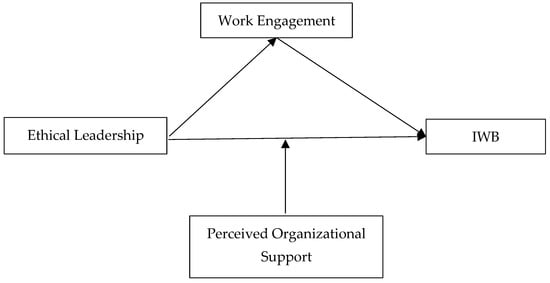 The current research benefits from combining three valid and commonly used theories to support the proposed hypotheses. In this sense, social exchange theory (SET), developed by Blau (1964), explains the innovative work outcomes of employees as a reciprocative behavior in response to the ethical behavior of leaders (i.e., faculty deans). Under the lens of SET, it can be interpreted that in social groups (i.e., faculty staff), ethical exchanges can reduce associated costs while increasing benefits. In this case, university teachers under ethical leadership perceive fairness, care, a transparent agenda, and support, which can trigger a positive work attitude in response (e.g., better engagement and IWB) (Islam et al., 2024; Sarwar et al., 2020). In the current model (see Figure 1), perceived organizational support (POS) further supports the notion of reciprocity as it pertains to signals of value, care, and supportive mechanisms in the organization that improve the overall experience of employees and, thus, their performance (e.g., IWB). Therefore, the premises of SET are highly relevant for understanding how ethical leadership can foster positive interactions and derive innovation from academic staff.