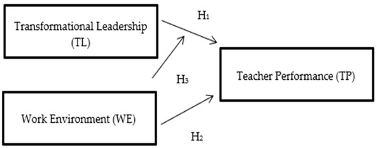 The relationship between the variables is illustrated in Figure 1. Transformational leadership (TL) serves as the primary independent variable, while the work environment (WE) functions both as a secondary independent variable and as a mediator. Teacher performance (TP) is the dependent variable. Specifically, the model examines the direct effects of TL and WE on TP, as well as the moderating role of WE on the relationship between TL and TP.