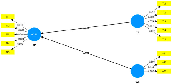 Figure 2 shows the measurement model, showing the latent variables (TL, WE, and TP) and their respective observed indicators. All items exhibit sufficient factor loadings, confirming the model’s convergent validity.