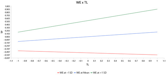 Figure 3 illustrates the moderating effect of WE on the TL–TP relationship. The results indicate that WE moderates the impact of TL on TP, with a moderation coefficient of 0.223 (p = 0.000). This confirms that while TL alone does not significantly impact TP, its effect becomes more pronounced in a positive work environment.