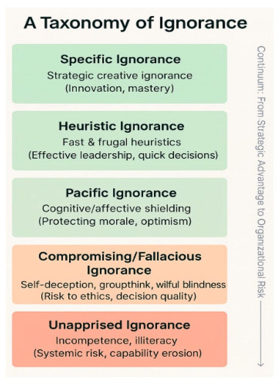 This category refers to the deliberate avoidance or suppression of inconvenient knowledge to pursue self-serving or group-serving outcomes, often associated with phenomena such as self-deception, dishonesty, groupthink, and willful blindness (Janis, 1982; Gilovich, 1991; Smithson, 2012; Lynch, 2016). Compromising ignorance is particularly dangerous as it erodes ethical decision-making, undermines organizational integrity, and perpetuates systemic failures.