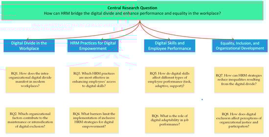 To organize these complex topics, a conceptual framework was developed. This framework links the central research question—how HRM can bridge the digital divide and improve performance and equality—with eight specific research questions. Each set of questions reflects a key area discussed in the literature: digital divide, HRM practices, digital skills, and inclusion.