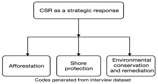 One central theme, “CSR as a strategic response”, was constructed using three codes generated from the interview dataset: afforestation, shore protection, and environmental conservation and remediation (Figure 2). The researcher examined the participants’ knowledge and perspective between the interconnection between environmental conservation and corporate social responsibility (CSR).
