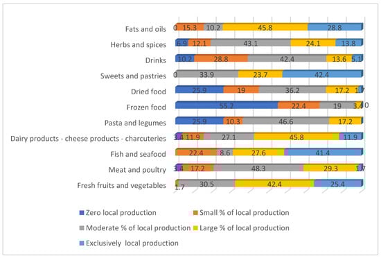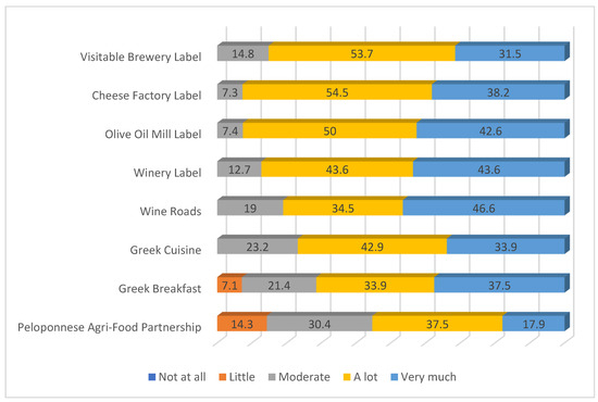 According to Figure 2, 74.6% of the participants consider fats and oils to have successfully integrated into tourism activities, while 69.0% of the respondents have the same opinion regarding fish and sea food. In the Peloponnese, there are famous olive groves, such as in the prefecture of Messinia, where Kalamata olive oil is produced. Therefore, it is logical that fats and oils have been successfully integrated into tourism businesses. Fresh fruits and vegetables are considered integral by 67.8% of the respondents. Sweets and pastries are considered to have been sufficiently integrated into the tourism sector by 66.1 of the participants. Additionally, 57.7% of the participants consider dairy products to have been satisfactorily incorporated. Furthermore, 37.9% of the respondents recognize the integration of herbs and spices, while 31.0% held this opinion regarding meat and poultry. In contrast, only 18.9% of the participants consider the integration of dried foods into tourism to be sufficient. Beverages are considered to be integrated by 18.7% and pasta and legumes by 17.2% of the participants. Finally, only 3.4% of the respondents consider frozen foods to be satisfactorily integrated into tourism.