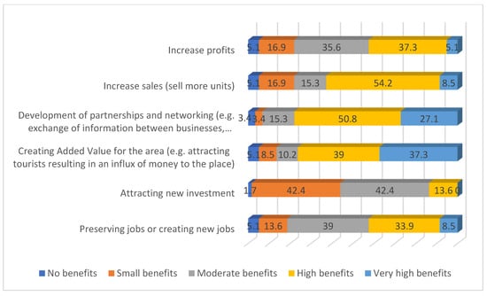According to Figure 3, 77.9% of the survey respondents recognize the development of partnerships and networking as a significant benefit of participating in initiatives related to food culture and tourism. Furthermore, 76.3% of the participants identify the creation of added value in the region as a significant advantage. Furthermore, 62.7% perceive sales enhancement as a benefit of such activities, while 42.4% recognize the positive impact on profit margins and the maintenance or creation of jobs. Finally, 13.2% of the participants consider the attraction of new investments to be a notable benefit.