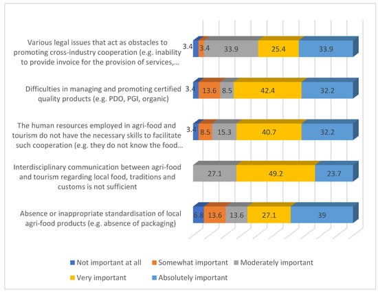 According to Figure 5, 74.6% of the participants believe that the potential of food culture has not been sufficiently exploited. They assert that numerous potential business opportunities have gone unexploited due to the challenges associated with managing and promoting certified quality products. Furthermore, 72.9% of the respondents highlight that the human resources employed in the agri-food and tourism sectors lack the necessary skills to facilitate effective collaboration. Additionally, 66.1% of the participants regard the deficiency in proper standardization of local agri-food products as a significant barrier while 59.3% express concern about various legal issues that hinder cross-sector collaboration.