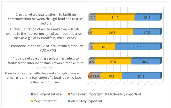 According to Figure 6, 96.6% of the participants argue that the further leveraging existing initiatives—such as the Greek Breakfast and the Wine Roads, which promote the interconnection between agri-food and tourism—would significantly enhance the development of gastronomic culture in these sectors. Furthermore, 93.2% of the respondents stressed the crucial importance of promoting the value of local certified products. Furthermore, 91.5% highlighted the necessity of providing advisory services and training to facilitate the integration of gastronomic culture and tourism. Furthermore, 89.8% recommended the creation of a digital platform to facilitate communication between the agri-food and tourism sectors. Finally, 83.0% of the participants underlined the need to create central initiatives and strategic plans that will prioritize the cultivation of local identity, gastronomic culture, and tourism.