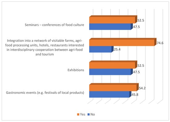 According to Figure 7, 74.6% of the participants showed a willingness to participate in initiatives related to the integration of visitable farms, agri-food processing units, hotels, and restaurants, which seek interdisciplinary cooperation between the agri-food sector and tourism. In addition, 52.5% of the respondents expressed interest in attending exhibitions or seminars and conferences focusing on food culture, while 54.2% emphasized their interest in gastronomic events.