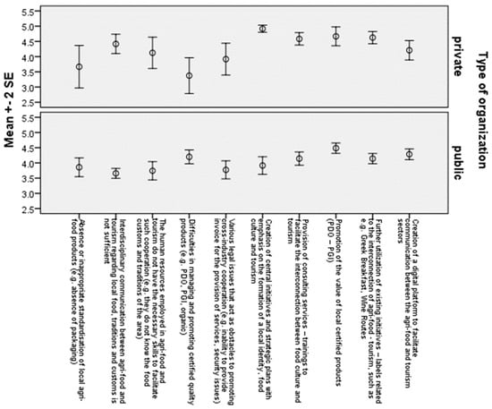The sample included 59 organizations that successfully participated, representing more than half of the total sample. This group involved 35 public organizations, which included municipalities and various public services, as well as 24 private organizations. This diversity reflects the dual aspects of the tourism and agri-food sectors in the region. By ensuring adequate representation from both sectors, the study facilitates the exploration of possible differences in perceptions based on the type of organization, thus strengthening the overall validity of the findings. The study involved a wide range of associations, including hotel and accommodation federations, restaurant associations and organizations representing agricultural cooperatives located in the mountainous, semi-mountainous, and coastal areas of the Peloponnese. This integrated approach sought to identify variations in perspectives that may arise based on the geographical context of the areas under study. The primary objective was to include organizations from different geographical locations within the Peloponnese. This strategic choice enhances the understanding of how geographical disparities influence views on the challenges and opportunities related to the advancement of food culture.