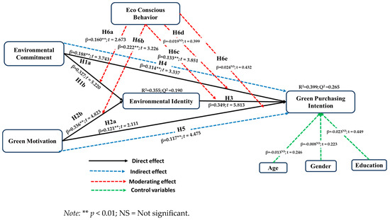 The study also evaluates the endogenous constructs’ R2, Cohen’s f2, and Q2 values. According to Cohen (2013), the f2 may be “small” (f2 ≥ 0.02), “medium” (f2 ≥ 0.15), or “large” (f2 ≥ 0.35). As Table 5 shows, the f2 of the endogenous constructs in this study ranged between “small” and “medium”. Additionally, the R2 value for environmental identity is 0.355, while the R2 for green purchasing intention is 0.399. According to (Cohen, 2013), an R2 value greater than 0.26 is considered large, provided that it also exceeds the minimum threshold of 0.02 for meaningful explanatory power. Accordingly, the proposed model exhibits an acceptable level of explanatory and predictive power. Furthermore, the Q2 values exceeded the 0.0 threshold, confirming the model’s predictive power (Hair et al., 2019).