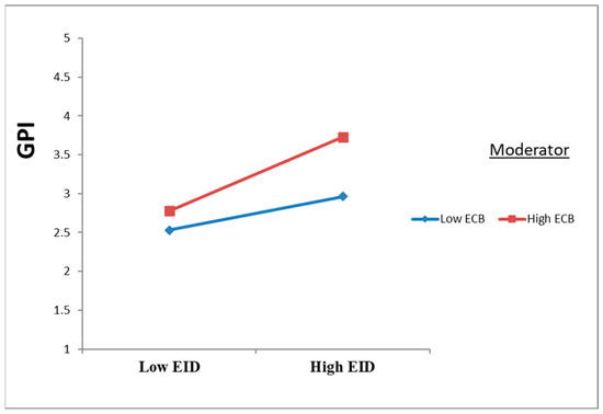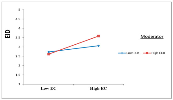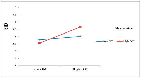 Similarly, Table 5 and Figure 4 showed that ECB moderates the relationship between GM on EID (β = 0.222 and p < 0.01). Specifically, the presence of high levels of ECB strengthens the effect of GM on EID, supporting H6b.