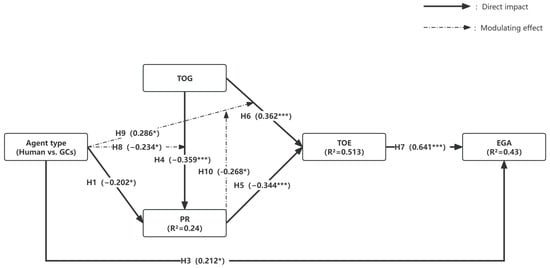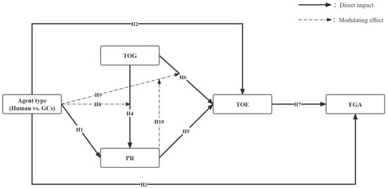 From the perspective of trust, variations in agent type (human vs. GCs) may significantly impact TOE (). Previous research has suggested that individuals tend to perceive artificial intelligence as an abstract and distant entity, whereas human agents are psychologically closer to users and capable of offering more emotionally resonant interactions (). Although both AI and human decision-making processes involve opaque “black box” elements, people are generally more tolerant of the opacity in human decisions due to their cultural and social familiarity (). Consequently, it has been proposed that users place greater trust in human agents, as they are perceived to be more similar to the users themselves and less associated with artificial intelligence (). Hence, we propose the following: