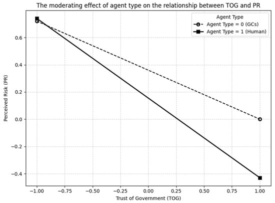 Agent type moderates the relationship between trust of government (TOG) and perceived risk (PR). Specifically, the negative effect of TOG on PR is weaker when the service provider is a government chatbot (GC) rather than a human agent.