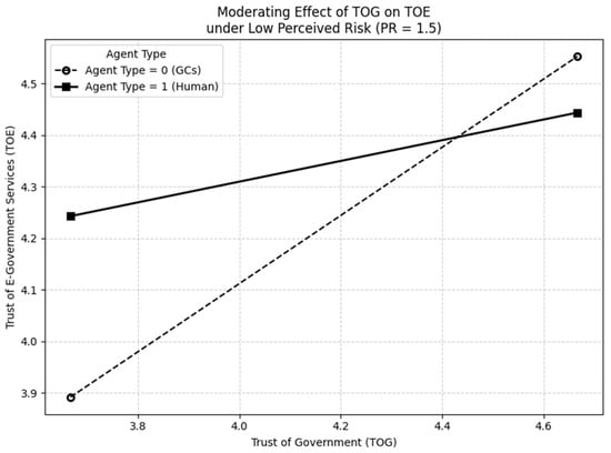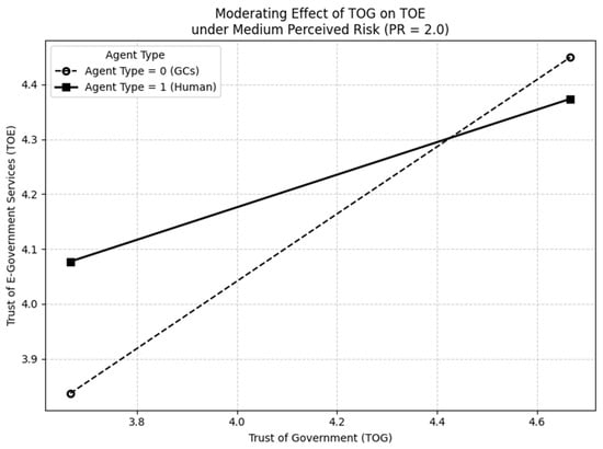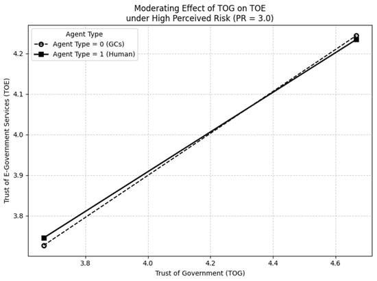 The results of a GC study on perceptions of government corruption indirectly support this view. The study found that when citizens perceive government institutions as lacking integrity or fairness (i.e., low-TOG scenarios) in high-risk situations—such as resource allocation—they may prefer AI-based services due to concerns about potential corruption or subjective biases associated with human-led services (). In other words, the perceived level of risk moderates the effect of government trust on trust transfer toward e-government services under different agency contexts. This finding highlights the important three-way interaction between PR, TOG, and agency type on TOE. Therefore, this study hypothesizes as follows: