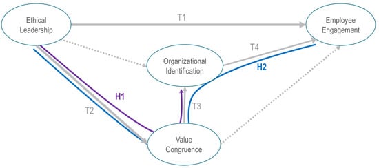 Finally, integrating our previous arguments, we propose a sequential mediation model where ethical leadership’s influence on employee engagement flows through both value congruence and organizational identification. This multi-stage process explains how leader–employee relationships ultimately translate into organizational-level outcomes, leading to the following hypothesis:
