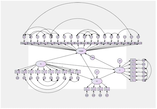 Using SPSS AMOS 29 for structural equation modeling, we investigated all model paths and correlations to assess the robustness of the model fit and analyze significant relationships between the latent variables using the established factors (Figure 2). The theoretical model demonstrated a good fit to the data: χ2(630) = 1503, p < 0.001, CFI = 0.94, and RMSEA = 0.058. Multiple significant paths emerged between the latent variables.