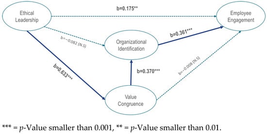 Hypothesis 2 was supported. Ethical leadership was associated with higher value congruence (b = 0.633, p < 0.01), which in turn was associated with higher organizational identification (b = 0.377, p < 0.001) which in turn was associated with higher employee work engagement (b = 0.361, p < 0.001). The bootstrap method was employed 2000 (times) to investigate the indirect effect of ethical leadership on work engagement. That relationship was significant, b = 0.127, p < 0.01; CI 95% = (0.029, 0.225). The remaining direct effect of ethical leadership on employee work engagement was significant (b = 0.175, p = 0.005).