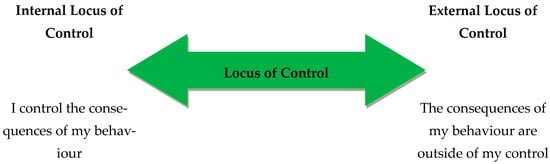 Locus of control (LoC) is a key psychological construct that reflects an individual’s belief in the degree of personal control over life situations. A distinction is made between internal and external locus of control. This construct was defined by () in his work in such a way that if an individual perceives reinforcement as something that is not completely dependent on his actions, then this event is perceived as the result of luck, chance, fate, as something that is under the control of others, as something unpredictable. He refers to this as a belief in external control. If a person perceives that an event depends on his own behavior or his own relatively permanent characteristics, he refers to it as a belief in internal control. LoC can then be understood as a construct that distinguishes the extent to which an individual believes that the results of his behavior depend on his own actions (internal locus) or, conversely, on external forces (external locus). It is a person’s belief about whether he can influence the course of situations in his life (; ). It is a belief that outcomes in life depend either on one’s own actions or on the influence of external circumstances (). This construct takes the form of a continuous spectrum, with individuals exhibiting different levels of internal or external control in different areas of life. The LoC continuum is illustrated in Figure 1.