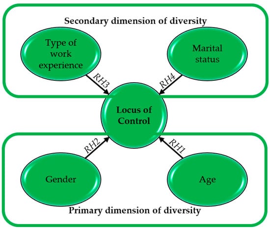 Figure 2 contains the structure of the research framework, where locus of control is the central element, potentially influenced by four variables representing diversity. At the bottom are the two primary dimensions of diversity: “Gender” and “Age”, linked by hypotheses RH2 and RH1. At the top are the secondary dimensions: “Type of work experience” and “Marital status”, linked by hypotheses RH3 and RH4. The research framework visually distinguishes between the two categories of diversity and their potential impact on LoC.