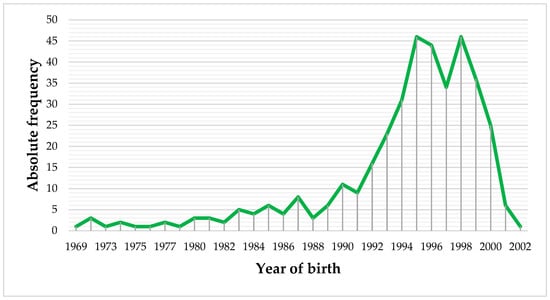 According to the Table 2, the research sample is gender-balanced. Out of the total set of 384 respondents, 199 were male (51.82%) and 185 were female (48.18%). The second question was a question that asked respondents about their year of birth. The results are presented in Figure 3.