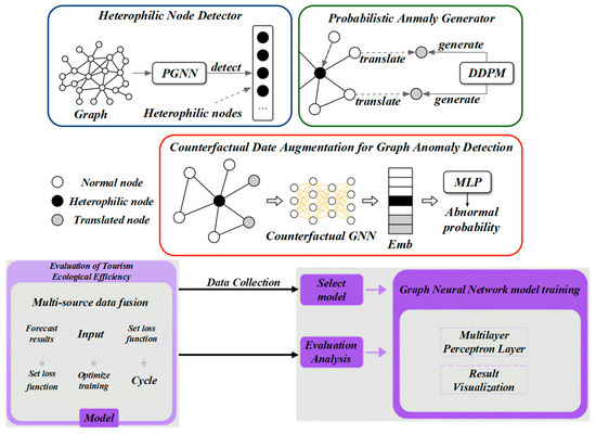 The evaluation model, as shown in Figure 3, is built around the task of assessing tourism’s eco-efficiency by leveraging multi-source data fusion and graph neural networks (GNNs). It begins with multi-source data fusion aggregating diverse tourism-related datasets to form the basis for subsequent analysis. It then leverages key components for graph-based operations: the Heterophilic Node Detector paired with PGNN processes the initial graph to identify heterophilic nodes, while the Probabilistic Anomaly Generator uses translation mechanisms and DDPM to generate anomaly-related elements and enrich the data for anomaly detection. For model training, it incorporates user ecological characteristics, constructs a heterogeneous graph from the fused data, builds a comprehensive training set, initializes parameters, strategically selects learning rates, batch sizes, and iteration counts, and uses an optimization algorithm to update model parameters to minimize loss until convergence. During training, the Counterfactual Data Augmentation for Graph Anomaly Detection module plays a pivotal role: it takes the graph, processes it via Counterfactual GNN to extract embeddings, and then uses an MLP to calculate abnormal probabilities, fully exploring the structural and attribute information of the heterogeneous graph. After training, the optimized graph neural network model, featuring a Multi-layer Perceptron Layer and result visualization capabilities, collaborates with all of the aforementioned components, integrates insights from heterophilic node detection, probabilistic anomaly generation, and counterfactual data augmentation, and ultimately empowers tourism decision-makers with precise and in-depth insights for tourism ecological efficiency assessment by leveraging multi-source data and GNN-based operations to comprehensively analyze the tourism ecosystem’s structural patterns and anomalies.