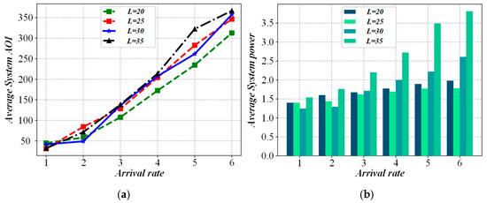 Performance under the training model. (a): Average system AOI values (b): Average system power values.