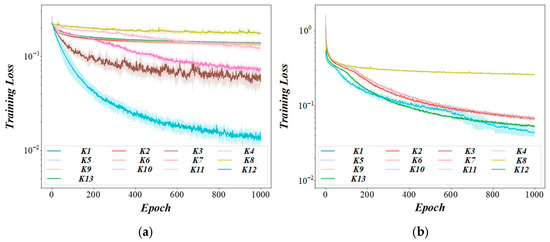 Convergence analysis of DIGRAF and baseline activation function. (a): Convergence of loss values under DIGRAF (b): Convergence of loss values under baseline activation function.