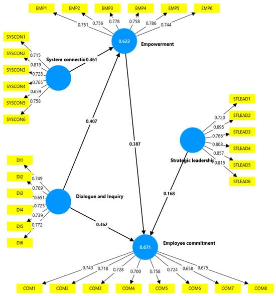 The results reveal that the effect of dialogue and inquiry on (i) employee commitment was positive and significant (H1: β = 0.362; p < 0.001) and (ii) empowerment was positive and significant (H2: β = 0.407; p < 0.001). The path coefficient of empowerment on employee commitment was positive and significant (H3: β = 0.387; p < 0.001). These results render support for H1, H2, and H3.
