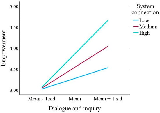 System connection positively moderates between dialogue and inquiry and empowerment such that at higher (lower) levels of system connectivity, the relationship between dialogue and inquiry and empowerment becomes stronger (weaker).