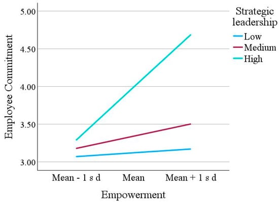Strategic leadership positively moderates between empowerment and employee commitment such that at higher (lower) levels of strategic leadership, the relationship between empowerment and employee commitment becomes stronger (weaker).