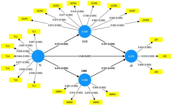 In this study, the conceptual model contains seven hypotheses. The results of the tested hypotheses have been summarized in Table 6. H1 is accepted, which proposed that transformational leadership (TL) is positively associated with gratitude as a commitment to reciprocity (GCR) (β = 0.574, p < 0.000, t = 13.834); H2 was accepted, which proposed that transformational leadership (TL) is positively associated with gratitude as a moral norm (GMN) (β = 0.410, p < 0.000, t = 8.160); H3 is accepted, which proposed that transformational leadership (TL) is positively associated with job satisfaction (JS) (β = 0.140, p = 0.007, t = 2.690); and H4 is accepted, which proposed that gratitude as a commitment to reciprocity (GCR) is positively associated with job satisfaction (JS) (β = 0.397, p < 0.000, t = 5.265). H5 is accepted, which proposed that gratitude as a moral norm (GMN) is positively associated with job satisfaction (JS) (β = 0.163, p = 0.010, t = 2.585).