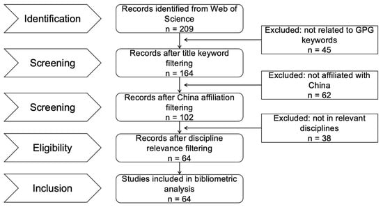 The initial search yielded 209 English-language records from the Web of Science Core Collection. As shown in the PRISMA flowchart (Figure 1), the dataset was refined through a three-stage screening process based on keyword relevance to the gender pay gap (GPG), institutional affiliation with China, and disciplinary alignment. This process resulted in the exclusion of 45 thematically irrelevant articles, 62 articles that lacked a China-based affiliation, and 38 articles that fell outside the relevant disciplinary scope. The final analytical sample comprised 64 studies, providing a thematically coherent and methodologically robust foundation for the bibliometric analysis of gender pay gap research in China’s financial sector.