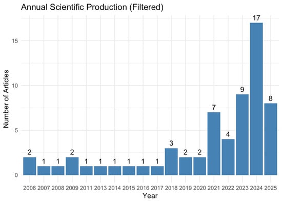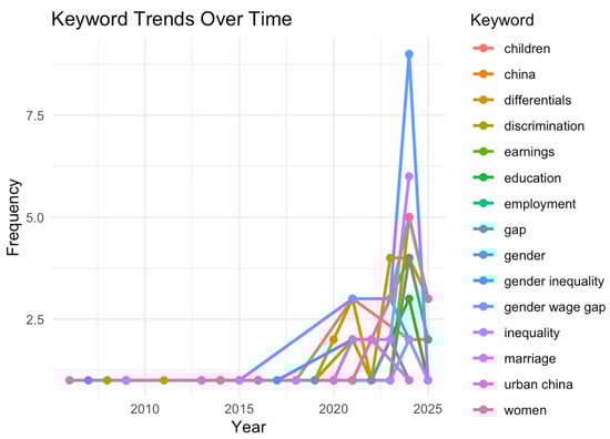 Publications on gender pay gaps in China’s financial sector, showing a significant rise after 2015, following the UN’s SDGs announcement. Source: authors’ elaboration based on the Web of Science Core Collection data (1975–2025), processed and visualized using the R Bibliometrix package.