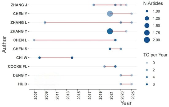 Top 10 authors’ production and their overall average number of citations per year over time in the field of gender pay gap studies related to China’s financial sector (2007–2025). Source: authors’ elaboration based on the Web of Science Core Collection data (1975–2025), processed and visualized using the R Bibliometrix package.