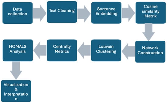 The analytical process used in this study follows a structured, multistage workflow that integrates text mining, semantic modeling, and network analysis to uncover the conceptual architecture of AI-for-Government research. As illustrated in Figure 1, the procedure begins with data collection and text cleaning, after which article abstracts are transformed into high-dimensional semantic vectors using sentence embedding models. Pairwise cosine similarity values are then calculated to construct a semantic network representing conceptual proximity among studies. The Louvain algorithm is applied to detect thematic communities, and centrality metrics identify the most influential or conceptually central papers within each cluster. Finally, HOMALS analysis classifies the corpus into conceptual orientations and visualizes their interrelations, providing a comprehensive view of the field’s underlying epistemic structure.