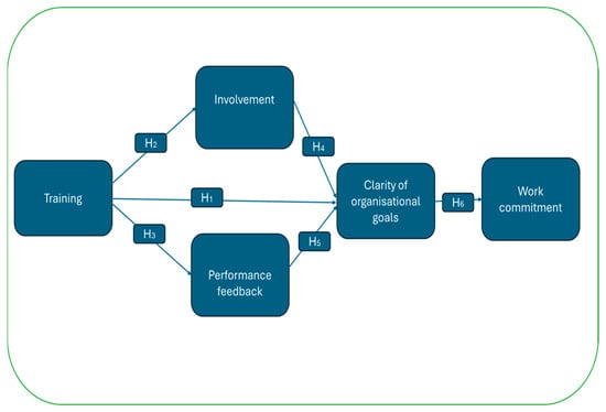 A mediator is a third variable that influences the relationship between two variables (Hair et al., 2022). Earlier, it was suggested and hypothesised that training influences clarity regarding organisational goals. In this study, it is further hypothesised and argued that this relationship is influenced by two mediators, viz. involvement and performance feedback. Moreover, this hypothetical relationship is based on the argument made in the introduction that similar research in the South African context is sparse. An international study conducted in the education sector of Oman recommended that the mediation role of the involvement be measured. The rationale for such a recommendation is that when involvement is measured as the mediator between training and goal clarity, such exchange leads to creativity and buy-in. In terms of creativity, managers and employees agree on the optimised way to achieve goals. When there is buy-in to goal setting, employees are more likely to support managers to achieve their goals (Balushi et al., 2024). With regard to performance feedback, it is important to support the relationship between government department managers and their employees. This adds a layer of transparency by sharing how the employees are performing in their jobs (Eng & Kohsuwan, 2025). Essentially, performance feedback provides constructive discussion between a manager and an employee, identifies areas of improvement, and earmarks employees for training. Hence, the following hypotheses are stated: