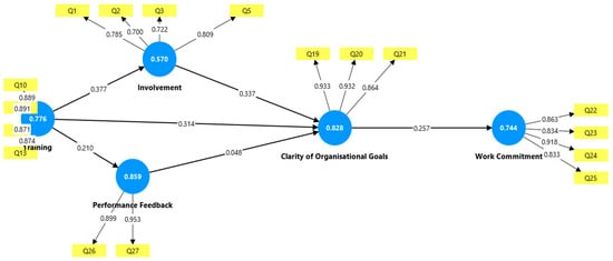 The significance of hypothesised paths was assessed using path coefficients (β), T-statistics, and p-values. A path was considered significant at p < 0.05. The results are summarised in Table 6. Thus, H1 is supported, indicating that training improves employees’ understanding of organisational goals. H2 is supported, demonstrating that training significantly increases employee involvement. Also, H3 was supported, suggesting that training enhances the effectiveness of performance feedback. Furthermore, H4 was supported, showing that higher employee involvement enhances understanding of organisational goals. However, H5 was not supported, suggesting that performance feedback alone does not significantly affect goal clarity. Lastly, H6 was supported. This indicates that greater clarity of organisational goals positively influences work commitment.