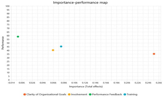 The study’s dependent variable was work commitment, while the independent variables included training and clarity of organisational goals. The mediating variables were employee involvement and performance feedback, which were included to examine the indirect effects of the explanatory variables on work commitment. Path coefficients (β), t-values, and p-values were examined to test the proposed hypotheses. In addition to traditional path analysis, Importance–Performance Map Analysis (IPMA) was conducted. IPMA is a statistical technique that visually reflects both the importance (total effect of a construct on the target variable) and performance (average scores of the latent variable) of each construct, providing actionable insights for prioritising management strategies (Hair et al., 2022).