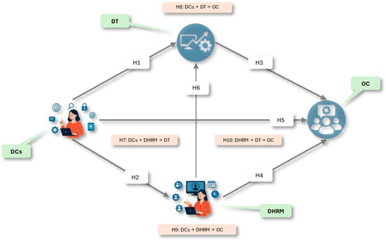 While DCs influence both DT and DHRM, it is also reasonable to expect a direct effect on OC. Organizations that develop digital skills not only implement new tools but also generate changes in internal values, beliefs, and practices (Cheng et al., 2024; Espina-Romero et al., 2024a). Therefore, the following hypothesis is formulated: