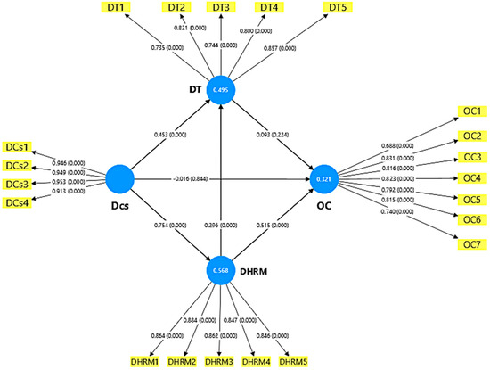 Figure 3 displays the final structural model estimated with SmartPLS 4, including standardized coefficients and significance levels. Significant relationships were confirmed from DCs to DHRM and DT, as well as from DHRM to DT and OC. In contrast, the direct effects of DCs and DT on OC were not significant, confirming the mediating role of DHRM.