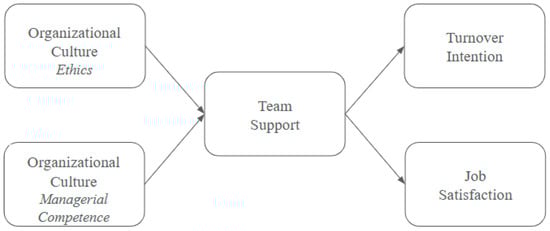 While ethical climate and managerial competence represent organization-level cultural resources, employees experience them partly through everyday interactions within their teams. Supportive team environments help translate ethical and competent management practices into positive employee outcomes (Džambić et al., 2025). Supportive teams can thus act as a proximal conduit through which broader cultural signals are translated into individual attitudes: when managers are perceived as competent and the organization as ethical, teams are more likely to coordinate, share workload, and provide emotional support, which in turn should be reflected in higher job satisfaction (Jankelová et al., 2023; Weng et al., 2016) and lower turnover intention (Joe et al., 2018; Zaheer et al., 2021). Moreover, evidence from organizational behavior research suggests that team climate mediates the relationship between ethical or managerial factors and turnover by increasing job satisfaction and emotional resilience (Zhu et al., 2017). On this basis, we propose team support as a key mediating mechanism between organizational culture and employee outcomes.