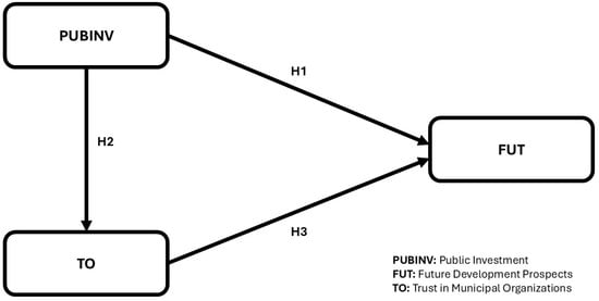 Based on the theoretical framework presented, a conceptual model was developed that represents the proposed relationships between the three main constructs of the study: Public Investment (PUBINV), Trust in Municipal Organizations (TO) and Future Development Prospects (FUT).