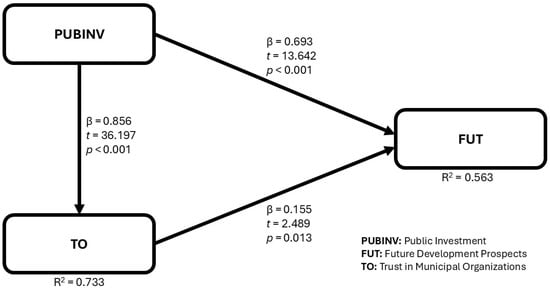 All hypotheses were confirmed: public investment is positively associated with perceptions of future development ( = 0.693; t = 13.642; < 0.001), corroborating the literature linking strategic investments with more favorable perceptions of innovation capacity and local development (Matvejevs & Tkacevs, 2025; Panori et al., 2022). Public investment is also positively associated with citizens’ trust in municipal organizations ( = 0.856; t = 36.197; < 0.001), with a high of 0.733, indicating that the perception of tangible investments in areas of direct impact, such as transport, energy, or digital services, is strongly related to higher levels of trust in municipal organizations. In turn, citizens’ trust is positively associated with perceptions of future development ( = 0.155; t = 2.489; = 0.013), suggesting a mediating relationship between investment and perceptions of the future. The coefficients of determination () for the endogenous constructs are reported in Table 6.